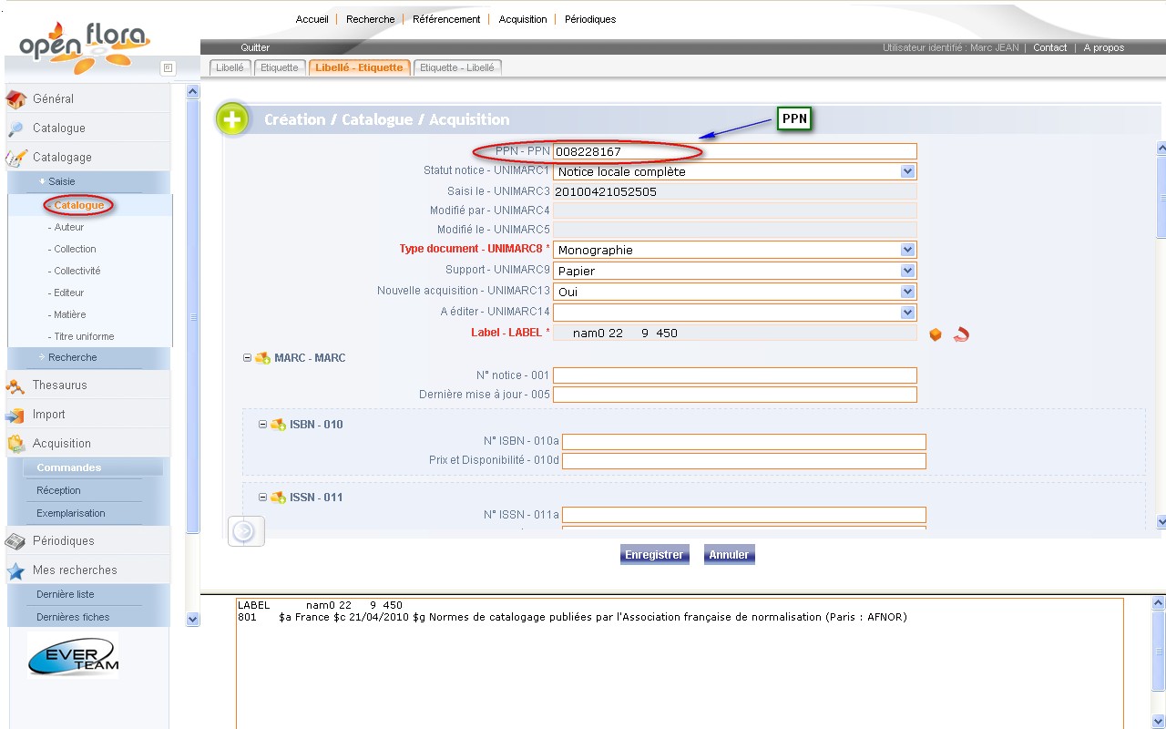 Il est déployable dans tous les types de bibliothèques. Mon intérêt en tant que bibliothécaire universitaire se situe là. En effet, j’ai remarqué qu’OpenFlora prend en compte la procédure de catalogage du SU français (SUDOC), avec la possibilité pour une bibliothèque qui participe à ce système, d’alléger le temps de catalogage en allant puiser dans le réservoir de notices du SU et d’insérer le ppn (N° de la notice) dans le champ prévu à cet effet dans la grille de saisie d’OpenFlora.