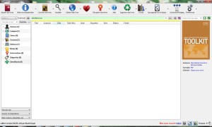Une fois l’installation terminée, la langue de travail choisie (parmi une dizaine), on obtient au démarrage une interface en trois colonnes que surplombe un espace de navigation horizontale avec des icônes d’administration de l’application, voir figure ci-dessous.