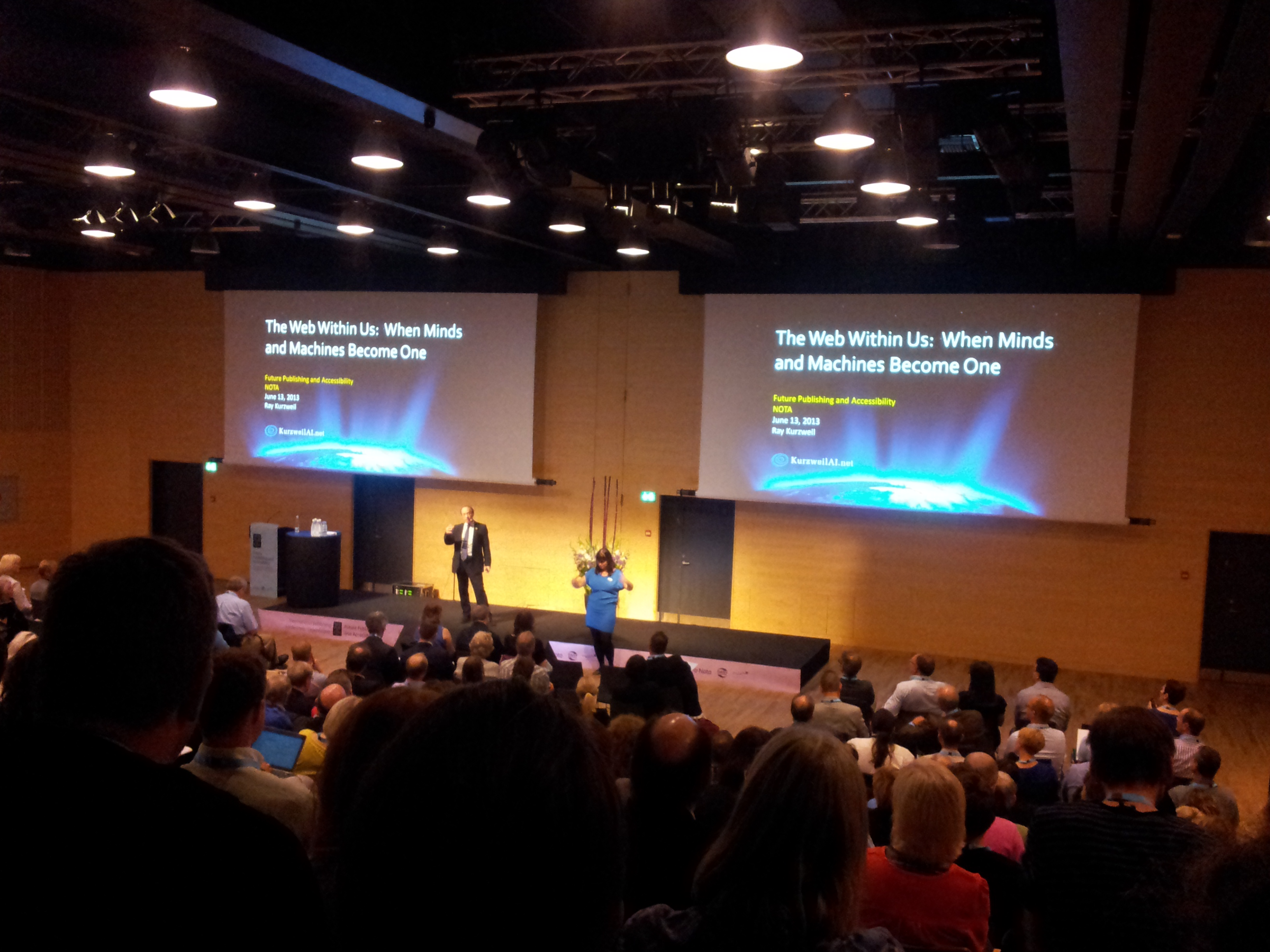 bien pour les séances plénières que pour les sessions spécifiques. Comment passer sous silence les interventions en plénière de Jimmy Wales, fondateur de Wikipédia ; de Ray Kurzweil directeur de l’ingénierie à Google ou encore de Michael Seadle, directeur de la prestigieuse Ecole de bibliothéconomie et Sciences de l’information de l’université Humboldt de Berlin. Mon intérêt a été plus marqué pour la présentation de Kurzweil qui, fidèle à ses théories futurologistes, prédit une hybridation prochaine entre intelligence artificielle et intelligence humaine. Tout un programme qu’il est difficile de relater fidèlement ici 🙂 !