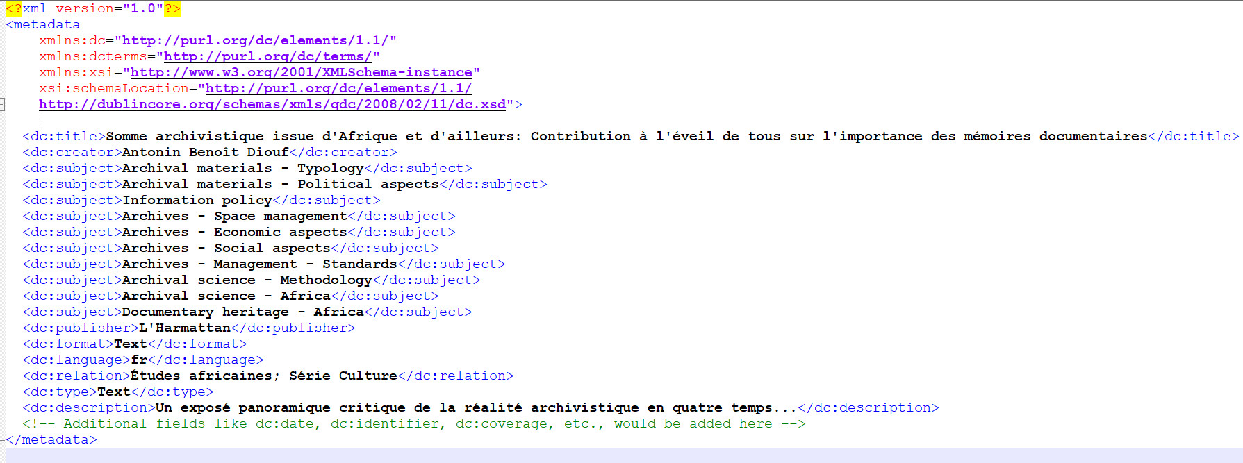 Cette structure XML encapsule les métadonnées descriptives du livre en utilisant la norme Dublin Core, qui est largement utilisée pour décrire une variété de ressources. Les balises dc:subject peuvent être répétées pour chaque descripteur, mot-clef, etc., relatif à l’ouvrage.