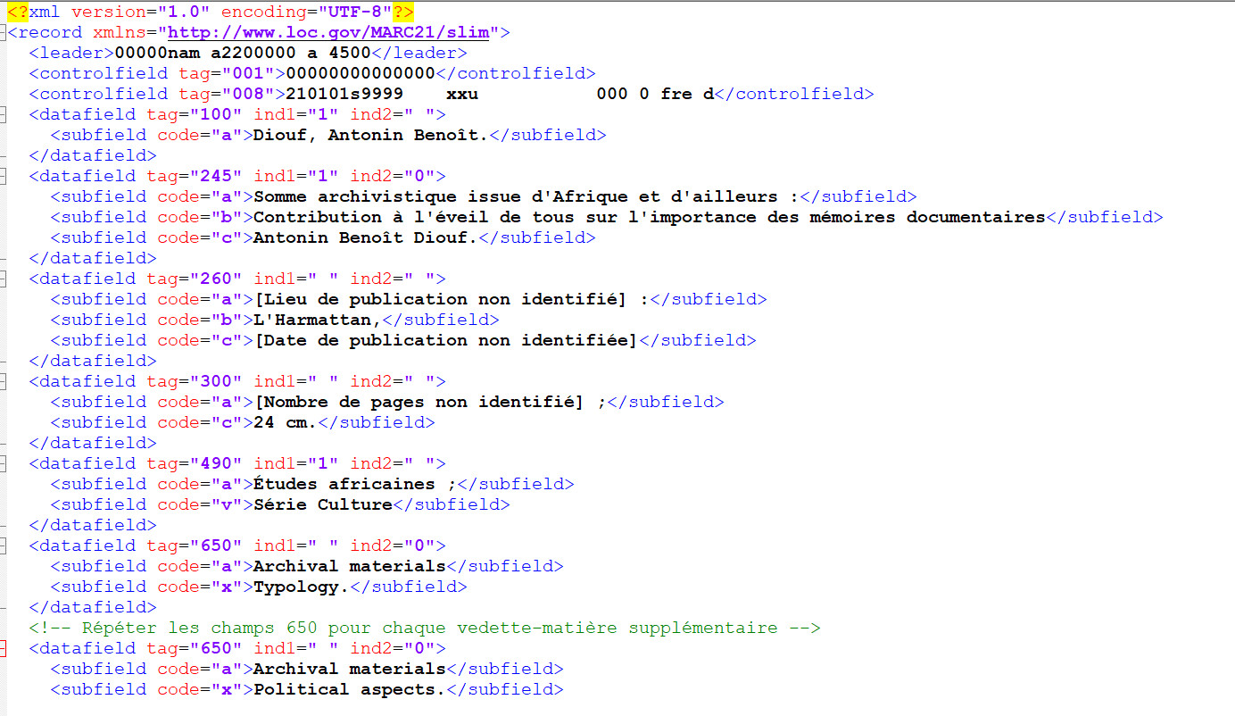 Je vais créer une description bibliographique simplifiée en format MARC 21 pour le livre intitulé « Somme archivistique issue d’Afrique et d’ailleurs : Contribution à l’éveil de tous sur l’importance des mémoires documentaires » de l’auteur Antonin Benoît Diouf. Veuillez noter que dans un contexte réel, cette description serait beaucoup plus détaillée et inclurait des champs pour le numéro de contrôle de la bibliothèque, les numéros ISBN, les mentions d’édition, l’adresse de publication, les notes physiques, etc.